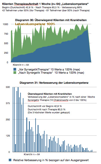 Die Veränderung kann man auch messen, durch einen Fragebogen erfassen. 206 Auszubildende haben ihn ausgefüllt und 64 Klienten mit Krankheiten, die 1 Woche Therapieaufenthalt im Kamala absolvierten. Eine weitere Gruppe von 22 Menschen nahmen an einer 7tägigen Magic Seminar teil. Hier sind einige Beispiele: