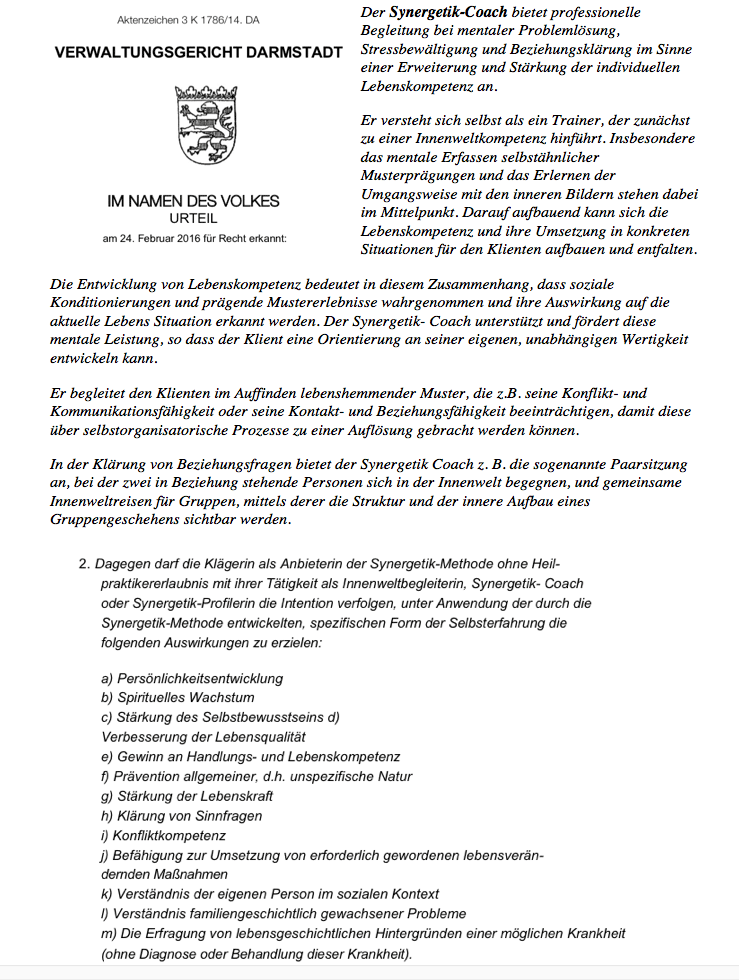 | Synergetik Therapie ist seit 1988 eine hochwertige neue Psychotherapie und wurde von den Gerichten blockiert