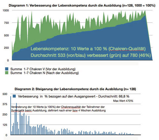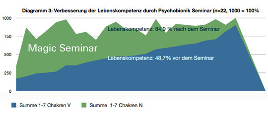 | Bestimmte Werte wurden erfasst. Hier die Fähigkeit zur Konfliktklärung | Die Grundenergie des 1. Chakra verbesserte sich auffäliig intensiv. | Auch im Magic Seminar gab es große Verbesserungen |